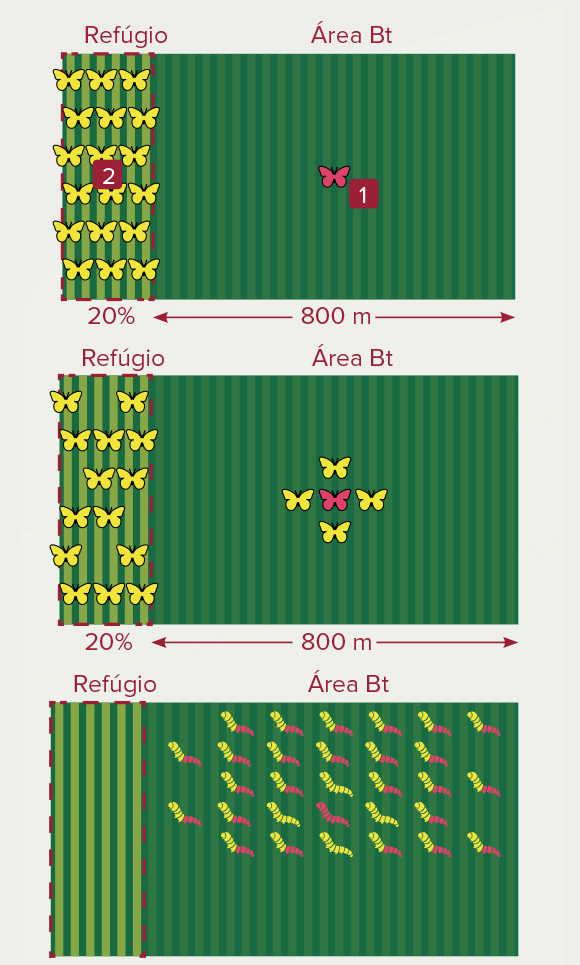 Ocasionalmente, um inseto resistente (homozigoto resistente) pode sobreviver se alimentando nas plantas Bt e atingir a fase adulta. As áreas de Refúgio, que são constituídas por plantas não-Bt, garantem que insetos suscetíveis (homozigotos suscetíveis) estarão presentes nas áreas com plantas Bt. Uma vez que há mais insetos suscetíveis comparados aos insetos sobreviventes na cultura Bt, é provável que um sobrevivente (homozigoto resistente) irá se acasalar com um inseto suscetível (homozigoto suscetível). A geração seguinte de lagartas será heterozigota e controlada com uma dose efetiva de Bt.