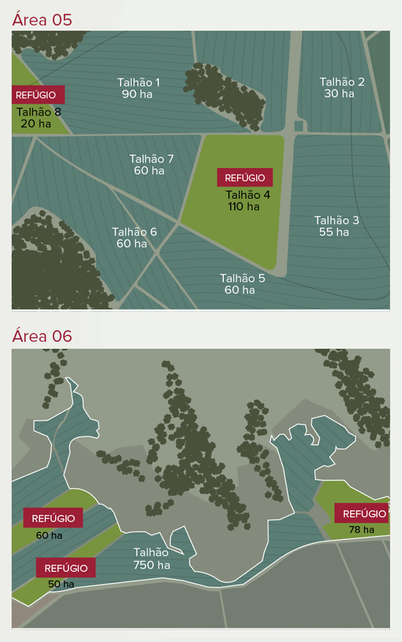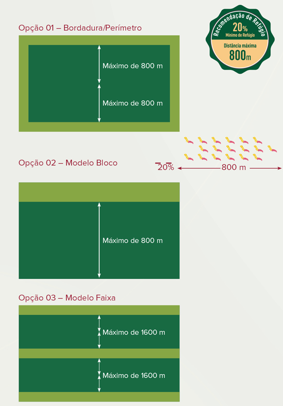 O Refúgio pode ser plantado com variedades de soja não-Bt (convencional ou RR) de ciclo similar às variedades de INTACTA RR2 PRO®, em no mínimo 20% da área total de soja plantada, a uma distância máxima de 800 m das áreas plantadas com soja INTACTA RR2 PRO®.